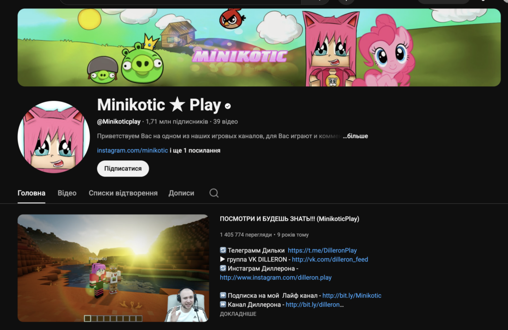 | Minikotik (Анастасія Перетятько) | YouTube | Відома блогерка з Одеси, спеціалізується на Minecraft |